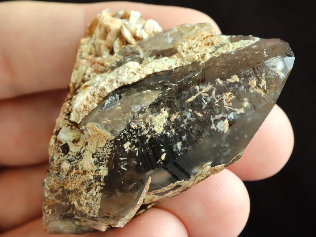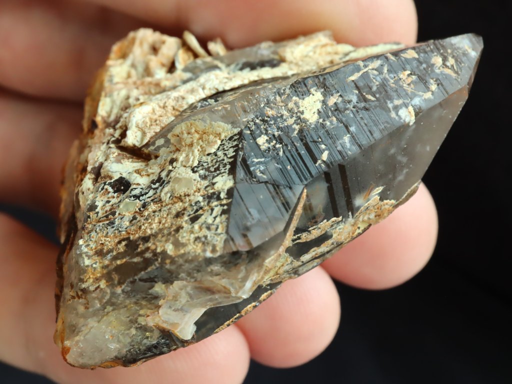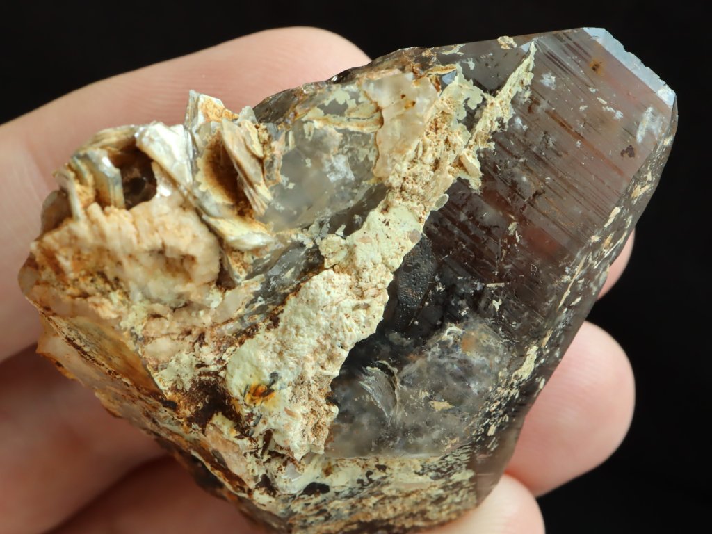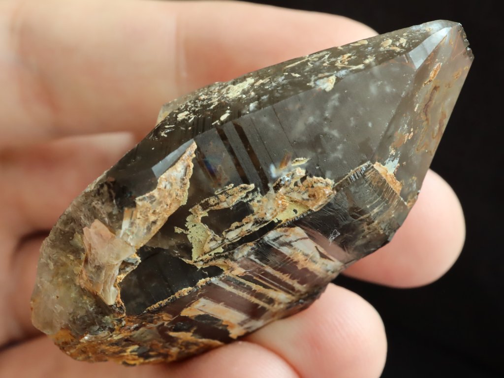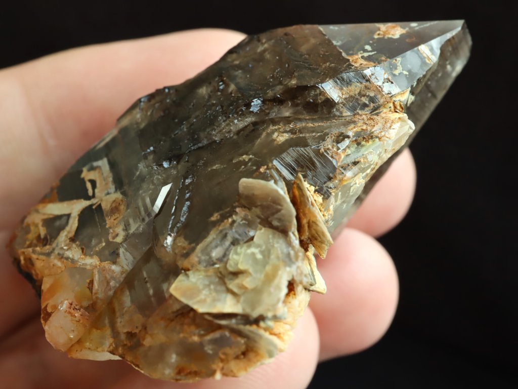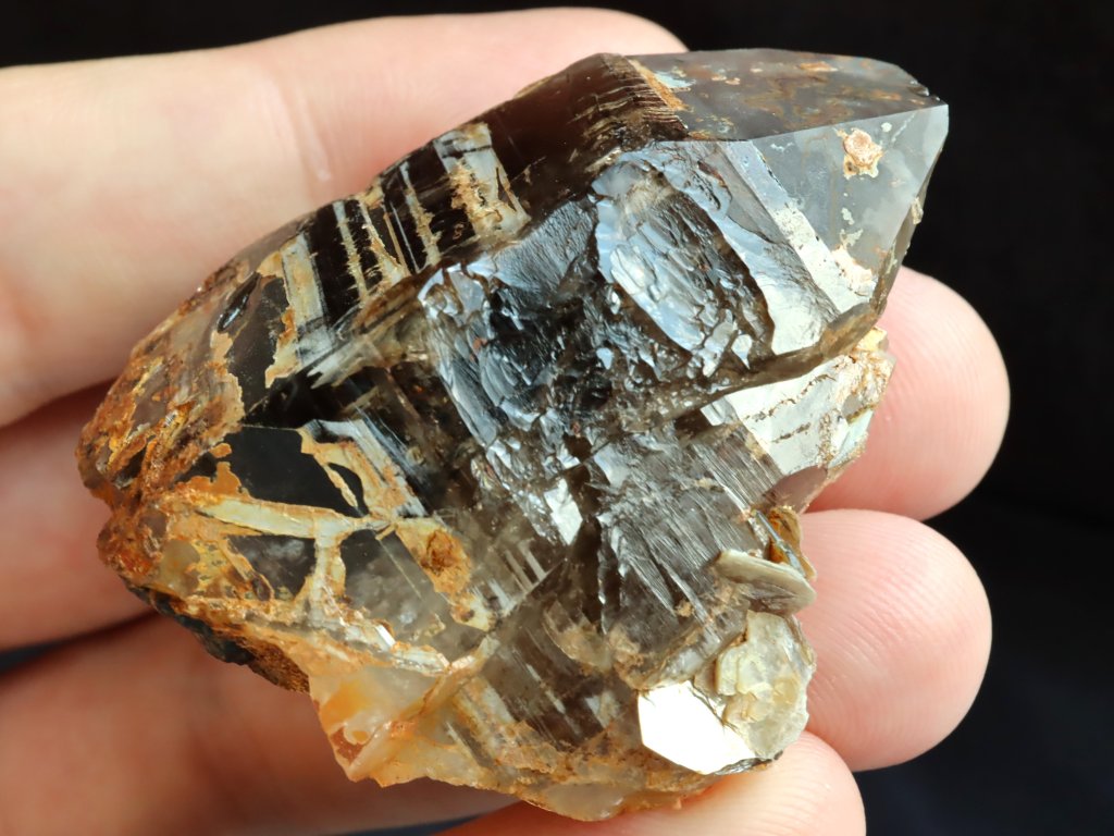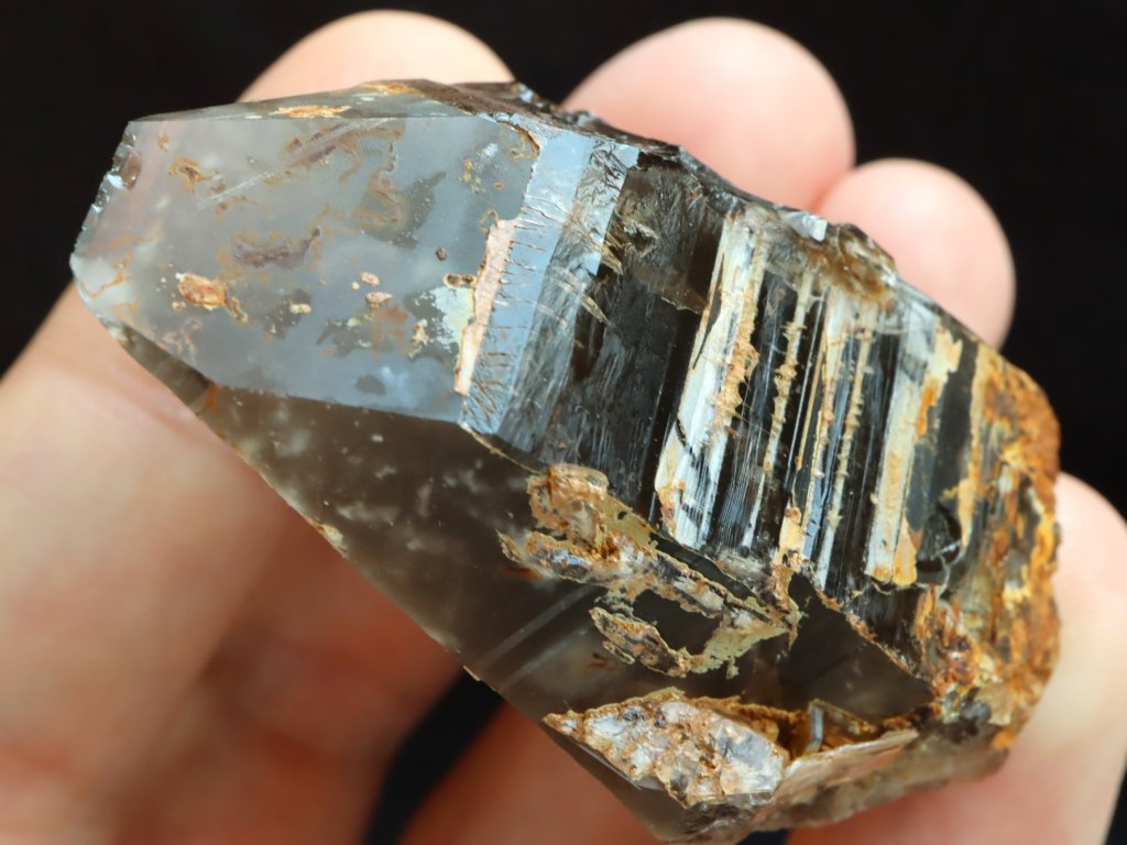 Morion má temně kouřový až černý odstín, místy se stopami oranžového limonitu.