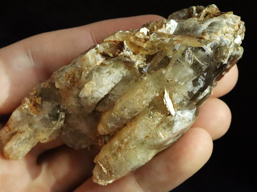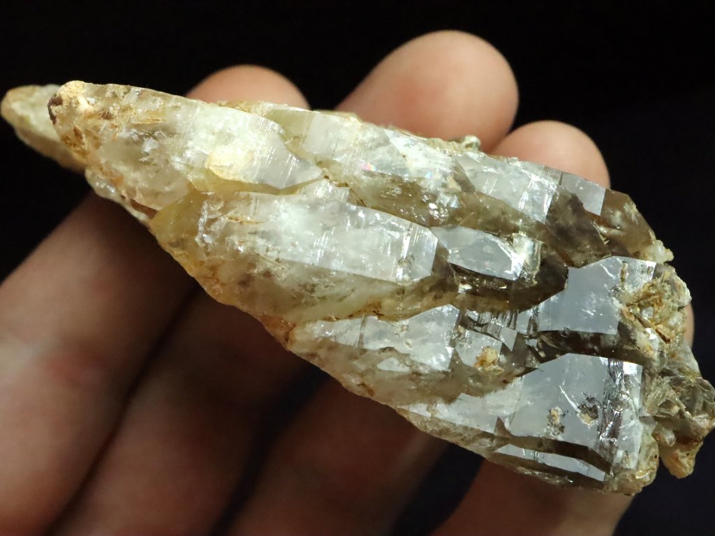 Tento vzorek záhnědy dlouhý až 9 centimetrů je zajímavě "složený" / srostlý z několika podlouhlých krystalků. Kámen lze tedy částečně označit i jako srostlici, krystalky však tvoří jeden celek.