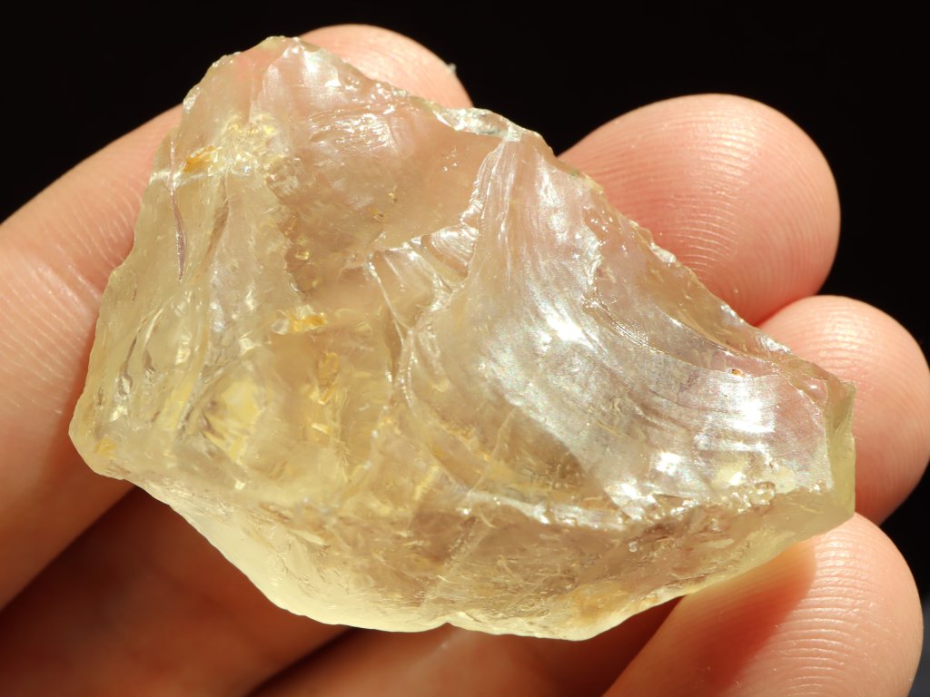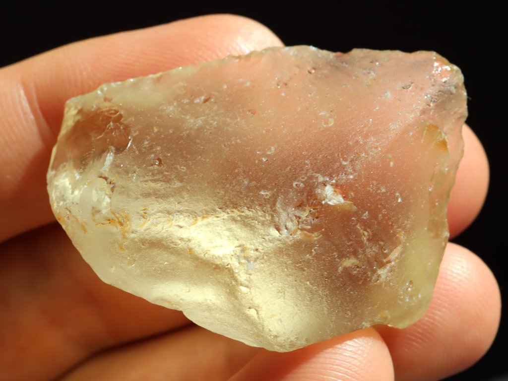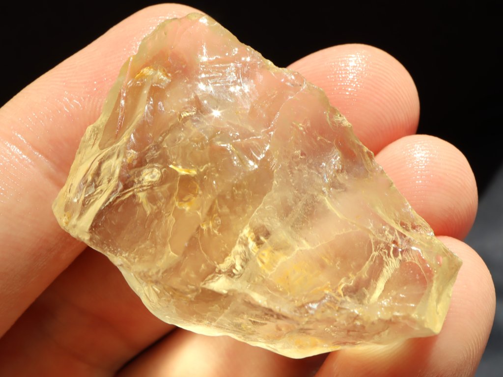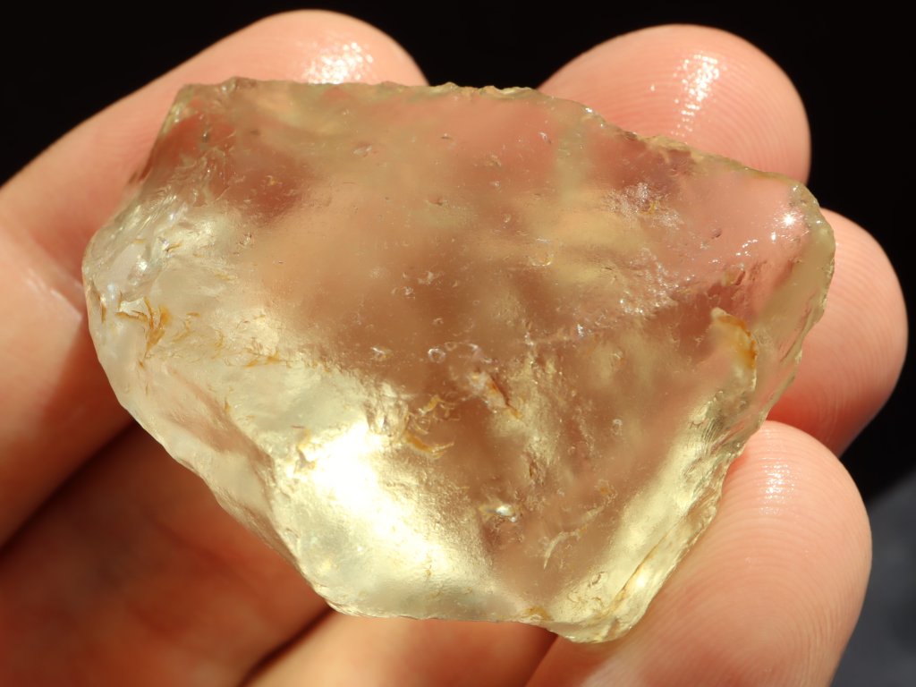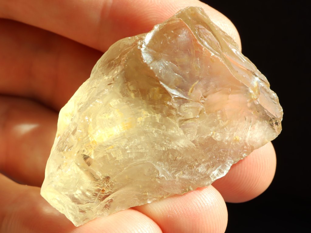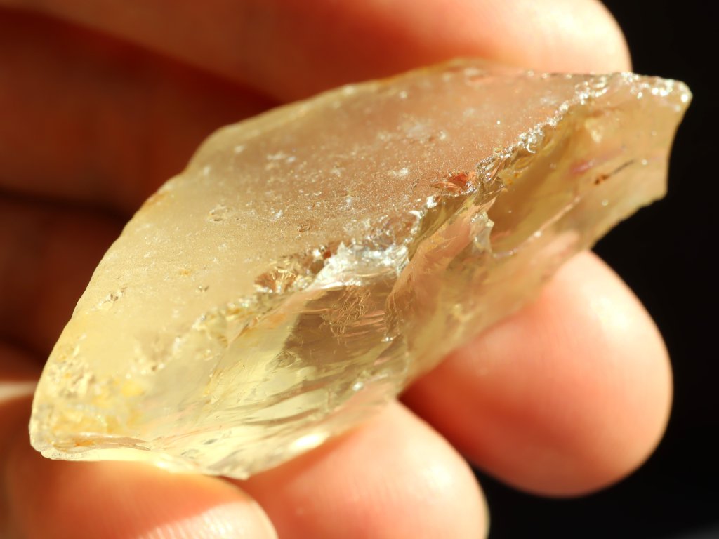 Druhá strana citrínku je naopak krásně lesklá a vy tak můžete při prosvícení sluníčkem či baterkou skvěle nahlédnout do skromného ale pěkného vnitřního světa. Tam se ukrývá především vysoká až drahokamová čistota s pouze několika půvabnými mlhovinkami.
